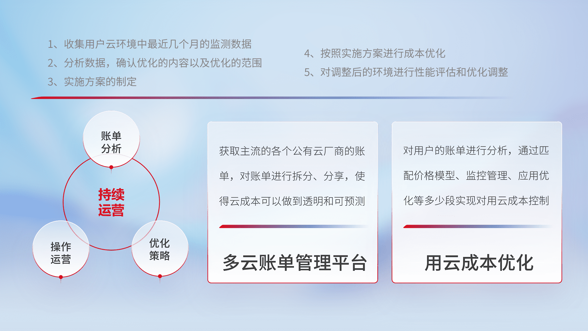 通过多云纳管,,以统一的资源数据模型把客户的云资源进行抽象和封装,,,,进而实现对多云资源的统一操作,,,,保障云资源管理的可靠性、、稳定性与可用性。。。量身定制化运维内容,,,配置、、开发运维、、、、补丁管理、、、备份、、、监控、、认证和访问管理、、审计和日常巡检等,,,保障在用云过程中的可靠度,,,,稳定度以及高可用率。。